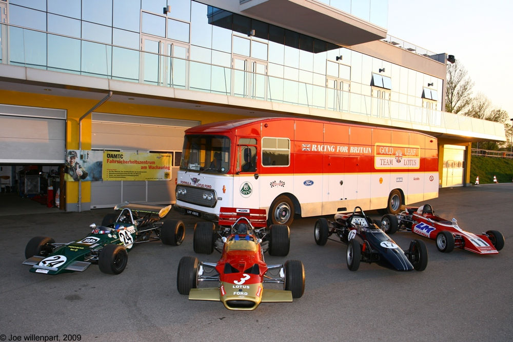 This is the 1967 AEC-Gold Leaf Team Lotus Formula 1 Truck, built on an AEC Swift chassis and originally registered LVF 480E. It was rebuilt by the team in early 2005, and is kept in Austria. This 2009 picture shows it following full restoration.