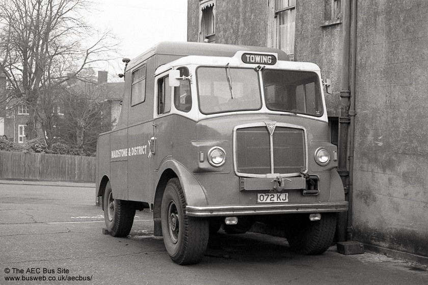 For a number of years in the 1970s, the recovery vechicle at the Maidstone & District Tunbridge Wells depot was an AEC Matador truck equipped with mini-workshop for carrying emergency spares. It was seen there in the summer of 1975 displaying the tradeplates on which it usually ran. |