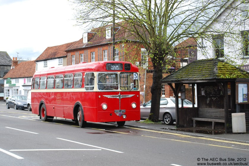 Safeguard's preserved AEC Reliance 200 APB waits beside the traditional bus shelter in Ripley Village on a tour from the London Bus Museum spring event at Wisley in May 2012.
