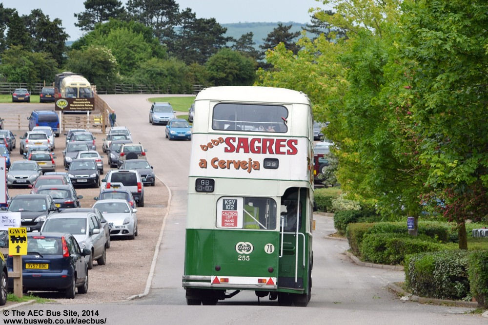 Preserved Carris (Lisbon) 255, a left hand drive AEC Regent III, arriving at Cheltenham Racecourse while running a free service in connection with an event organised by Stagecoach in May 2014.