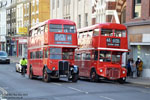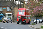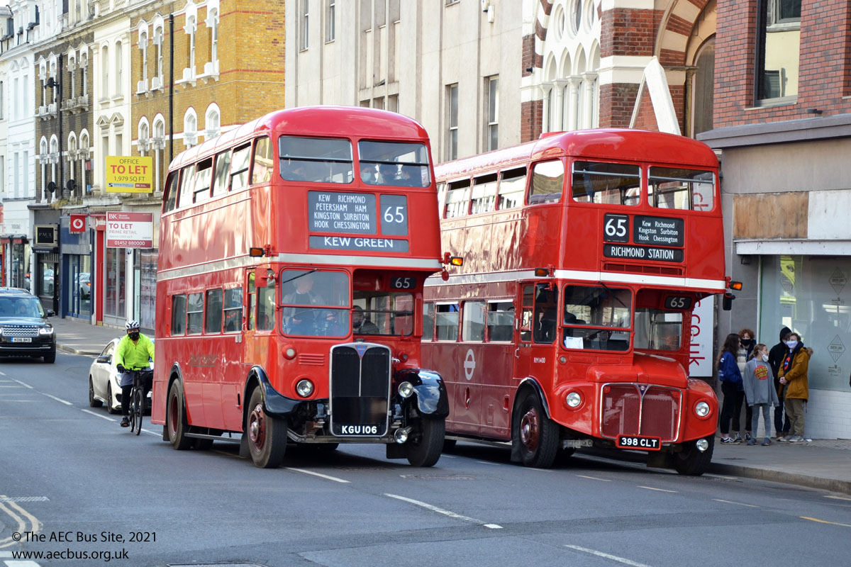 Two generations of AECs, preserved RT2177 and RM1400 stand next to each other at Richmond during the London Bus Museum April 2021 route 65 running day. |