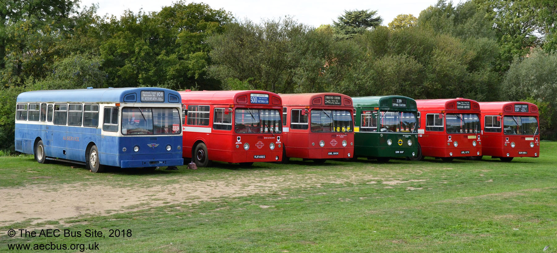 A line up of preserved former London Transport AEC Swifts and Merlins at an Epping Ongar Railway event in September 2018, featuring SM88, MBS444, MBS641, MB90, SMS97, SMS369. Also present at the event were operational MBS539 and SM1. |