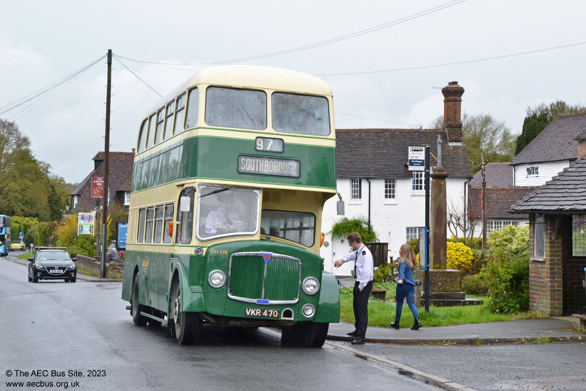 Preserved Maidstone & District AEC Regent V VKR 470 takes a time check at Hartfield while returning from Holtye Common during the 2023 East Grinstead running day. This is a long established and popular event. |