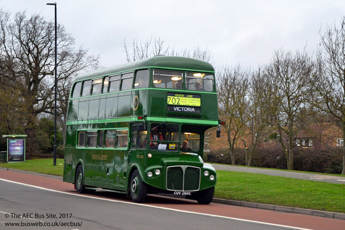 London Bus Company Routemaster coach RCL2260 passes through Langley en route to London during the Reading Buses route 702 running day on Christmas Eve 2017. |