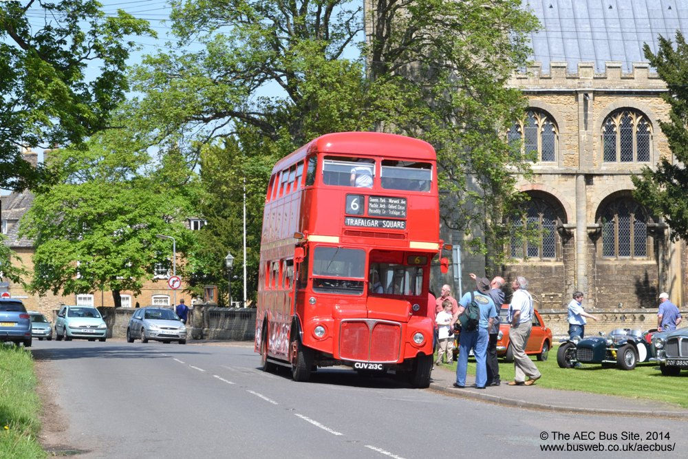 Routemaster RM2213 of A1 Bus poses at Thorney Abbey in Cambridgeshire during a May 2014 running day based at Whittlesey.