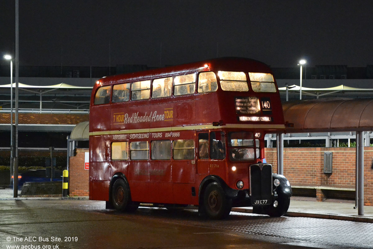 One of the numerous former London Transport AEC Regent III 'RT' class, RT714 is one of those repatriated from Canada by the London Bus Company and returned to service in the UK. It was pictured at Heathrow during a running day organsised by the London Bus Museum in November 2019. |