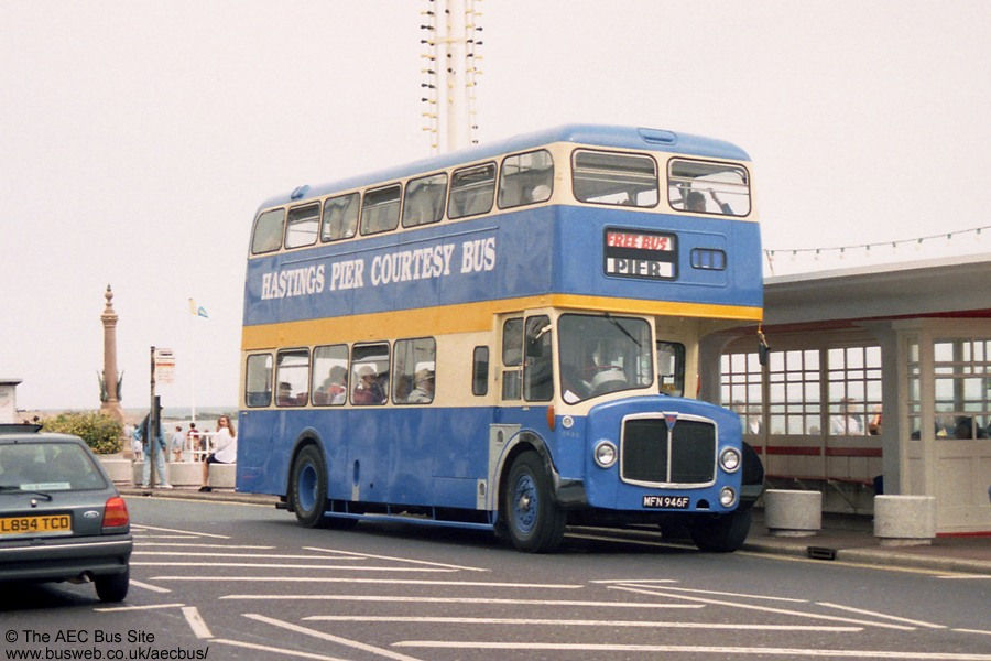 East Kent 7946 was withdrawn from service early and spent many years as a ticket office at Hastings for Maidstone & District and Hastings & District. It was then returned to service, passing via Hastings Buses to South Coast Buses, where it saw sporadic use on contracts and reliefs right into 1999. Here it is on a Hastings Pier service in the summer of 1994, still in H&D livery. This bus was later transferred within Stagecoach back to East Kent as a special events vehicle, repainted in traditional livery, and appears regularly at rallies in the area. Further pictures are on the Before and After page. Additional info from Paul Houselander and M&D and East Kent Bus Club. |