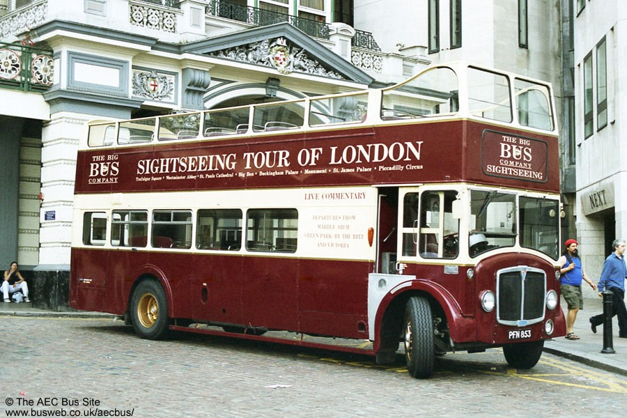 The first batch of East Kent Regent Vs had unusual full-front bodywork. Four of these outlived the rest of the batch by being converted to open-top for the Isle of Thanet service. After a spell in preservation, PFN 853 passed to London sightseeing firm the Big Bus Company. It was seen at Charing Cross station in August 2004. It subsequently passed back into preservation ownership in 2006. |