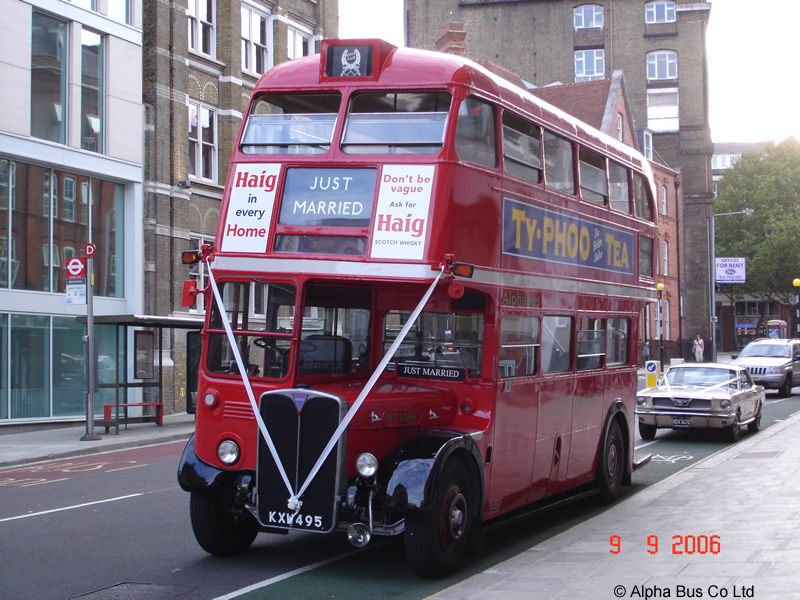 A popular and increasing use for classic AEC Regents and Routemasters is for wedding hires. Ex London Transport RT1396, owned by AlphaBus, was seen in this role at Putney in September 2006. Photo by Mike Tamkin. |