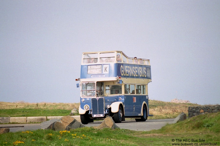 Former London Transport RT class Regent IIIs were be found running the summer open-top service on the channel island of Guernsey up to 2000. Number 14, originally RT2494 (KXW 123), was seen at work in the 1994 season. With the demise of Guernseybus, the three open-top Regents plus an unused closed top model and a brace of open-top Leyland PS1 Tigers all went to dealer Nash of Weybridge for preservation or resale. RT2494 is now privately preserved in Guernseybus livery. |