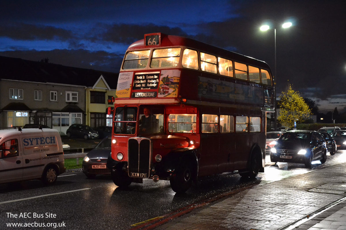 Here is 1947 built AEC Regent III RT3062, still in revenue earning service and pictured doing what it was built to do 71 years earlier - taking Londoners back to their homes in the suburbs. The occasion is the Central Line tube strike of 7th November 2018, when heritage operator London Bus Company was contracted to provide service extras on a number of routes including the 66 between Leytonstone and Newbury Park. Already blinded up for its return journey, it is seen inching towards Newbury Park station in heavy traffic.