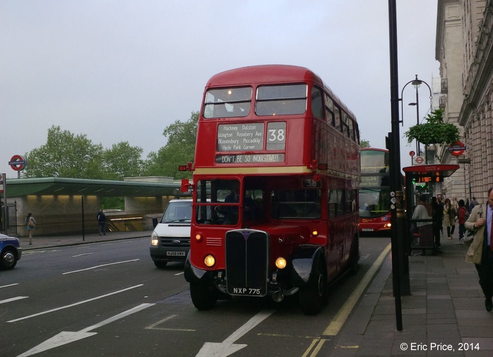 An RT on a Central London scheduled passenger bus service in 2014. As correspondent Eric Price put it: "Who says tube strikes aren’t useful?" It was running service extras on the Victoria to Hackney 38 service. Photo by Eric Price. |