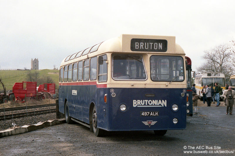 London Transport tried an experimental batch of dual-doorway AEC Reliances. Dual-door bodies on a high floor chassis always seemed to be an uncomfortable combination, and the LT vehicles found new owners after a relatively short period of time. One of them, 497 ALH, was bought by well-known Somerset independent operator Brutonian and was seen at the company's premises in April 1986.
