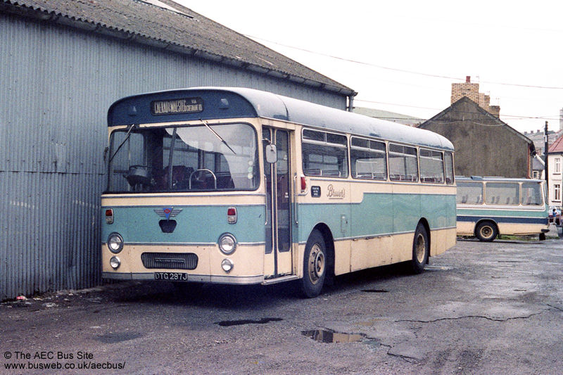 Another of Brewers' AEC Reliances, newer Willowbrook bodied DTG 297J was seen at the Brewers depot at Caerau, also in October 1982. Brewers had a depot in both of the main communities they served, Caerau and Maesteg - where the depot was located adjacent to another well-known independent, Llynfi Motors. |