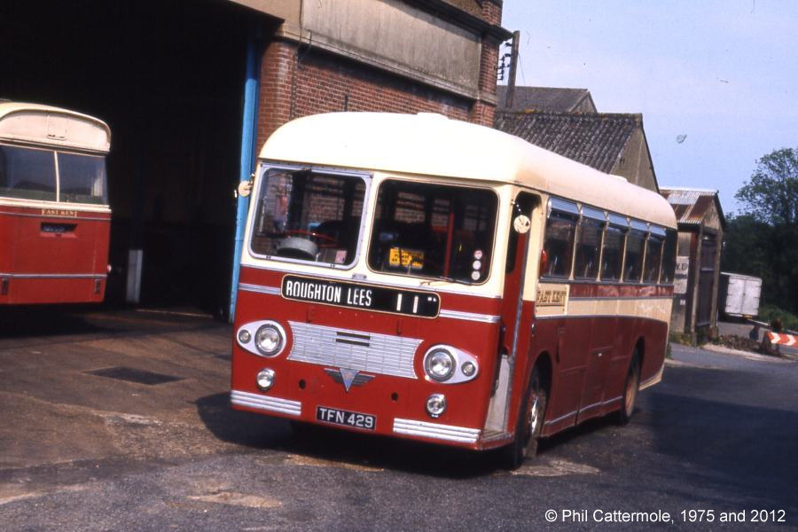 Nearby East Kent was also an avid user of AEC Reliances. TFN 429 and TFN 406 were members of a large batch of Park Royal dual-purpose vehicles, that were used on express services as well as service work when new. Later in life they were downgraded to local service work. They were seen at work in 1975 with 429 pictured in June in traditional EK livery while 406 had been freshly painted into National Bus Company red when pictured the following month. The location is the former depot and bus station in Ashford town centre, now the site of a leisure centre. It had previously been a Maidstone & District depot before transfer to East Kent in 1973, when East Kent's operations at Rye transferred to M&D at the same time. Photos by Phil Cattermole. |